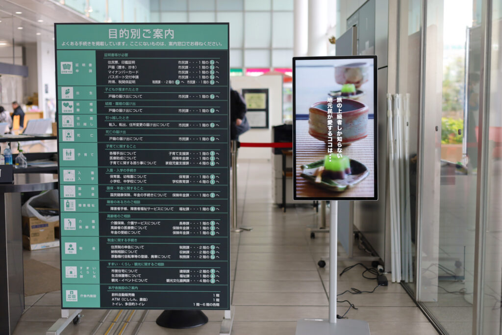 導入当初は、庁内の各課に貸し出してイベントや展示会で活用してもらうことを想定していましたが、現在は市民の皆様への「重要な案内表示」として、市役所の正面入口でフル稼働しています。