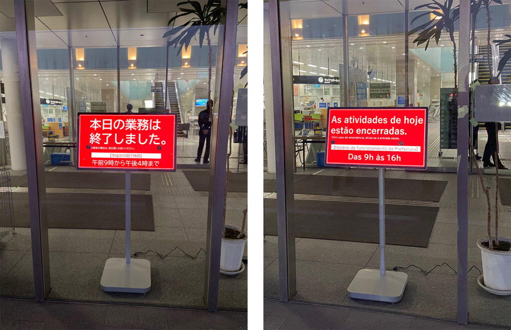 西尾市はブラジルやベトナム出身の外国人市民の方も多いため、日本語以外の言語の案内もスライドショーで表示し、どなたが見ても「現在は閉まっていること」や「夜間受付の場所」がひと目でわかるようにしています。