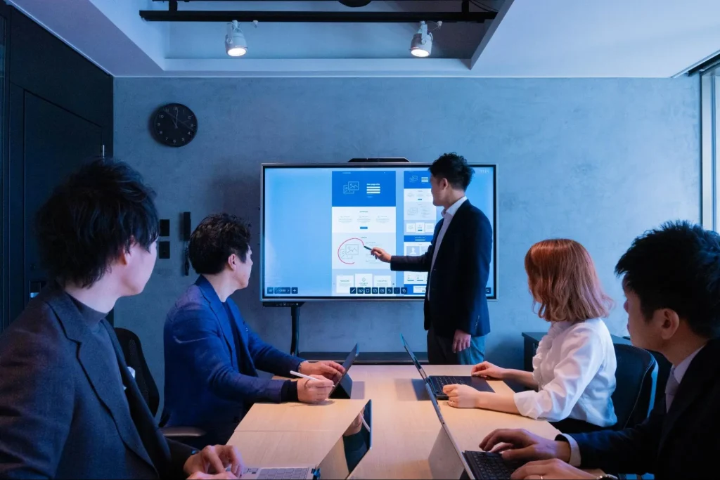 例えば、会議室に大型ディスプレイを設置すれば、リモート参加者の顔を大きく映し出し、まるで同じ部屋にいるような感覚になれます。さらに、そこに「ホワイトボードのように書き込める機能」があれば、議論の可視化が可能になり、生産性は飛躍的に向上します。