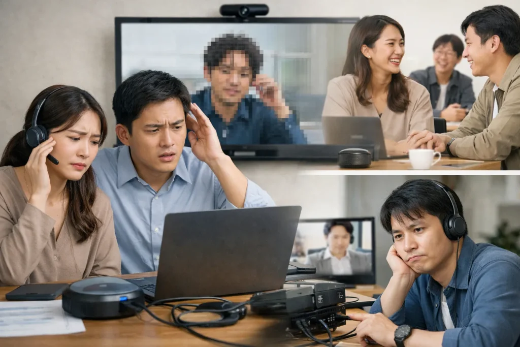 「声が聞こえません」「画面が固まりました」といったトラブルは、会議の腰を折る最大の要因です。特に会議室側のマイク性能が低いと、オンライン参加者には「誰が何を話しているか分からない雑音」しか届かず、議論に参加できなくなります。また、ハウリングの発生も頻繁に見られるトラブルです。