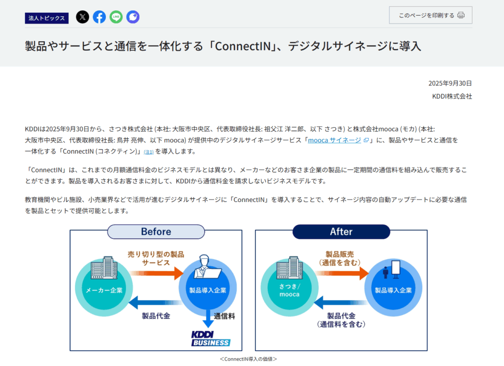KDDI BUSINESS 法人トピックス「mooca サイネージ」掲載ページ